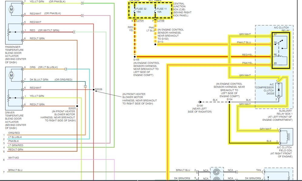 I attached a wiring diagram of the compressor circuit for you as well. If you have a test light or voltmeter, we can do some testing to find the fault.