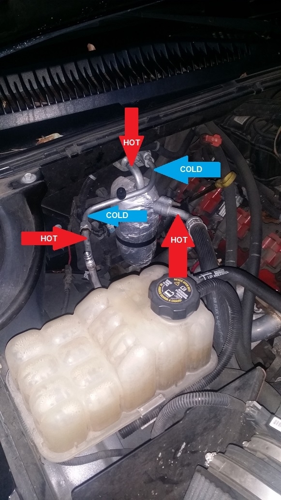 One day the AC was working great and then the next day it was blowing hot. The compressor is cycling on and off. I checked the inlet blend door actuator and it seems to be working, I say this because as I turn it from hot to cold I can feel the actuator turning when I place my finger on it. I jumped the low pressure switch and still no cold air. the compressor is clicking on and off, not sure if it is doing it too fast or not because I am not sure how fast that cycle is suppose to be. I put a gauge on the low side, the only gauge I own is from one of those cans you buy from the auto part stores, and the gauge fluctuates back and forth from side to side. I also reset the AC control module by taking out the fuse and following a outlined sequence of turning the key on and off. Also, last year the system was vacuumed down and the orifice tube was replaced. Not sure if this will help but at the accumulator one line is cold and the other is not.