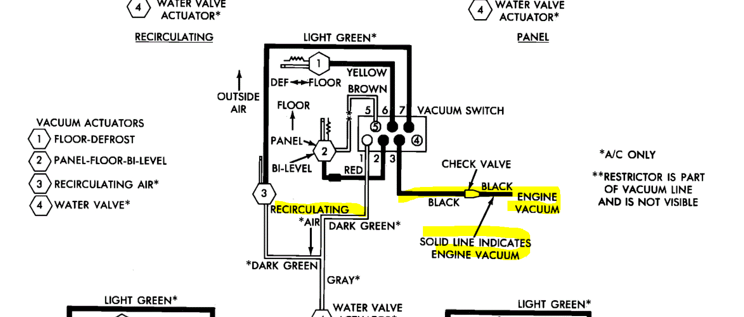 Also, when you say the A/C doesn't work at all, by chance, are you hearing the A/C compressor actuate? Again, the air temp door (blend air door) that controls the temp of air entering the vehicle is actuated by engine vacuum, so it could be the same issue. If there is no engine vacuum making it to the right places, that will prevent things from operating properly. In addition, the defrost position is a default area in the event this happens.