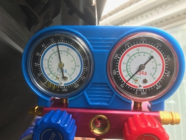 The system has two issues. First issue it definitely has a leak somewhere. I did a vacuum test. It held it okay for around an hour. Then when I come to but the R134A gas into it, it only took up to at least 9fl oz. It wouldn’t take anymore, yet the sticker on the car says it should have upto 40fl oz. Anyway, left it a couple of days, put my manifolds on the car, to find the pressure has dropped considerably. Even a week later, the system had nothing in it. So there is a leak but that’s easy to solve.