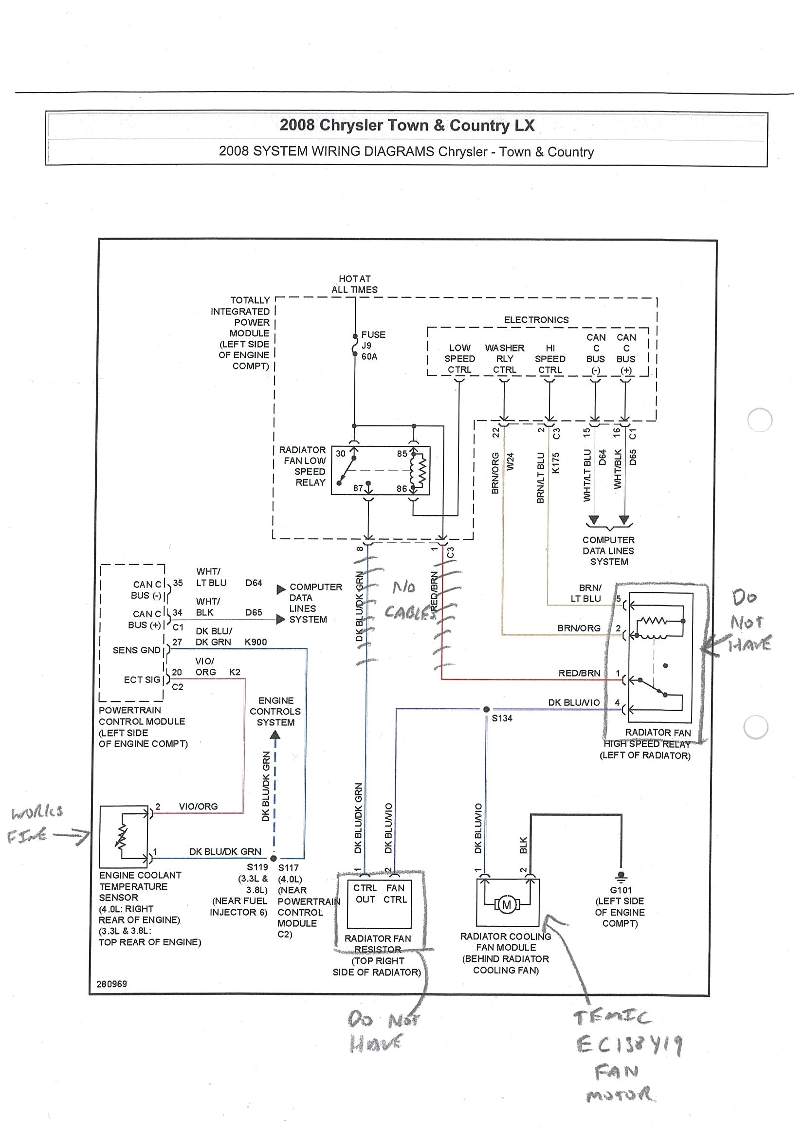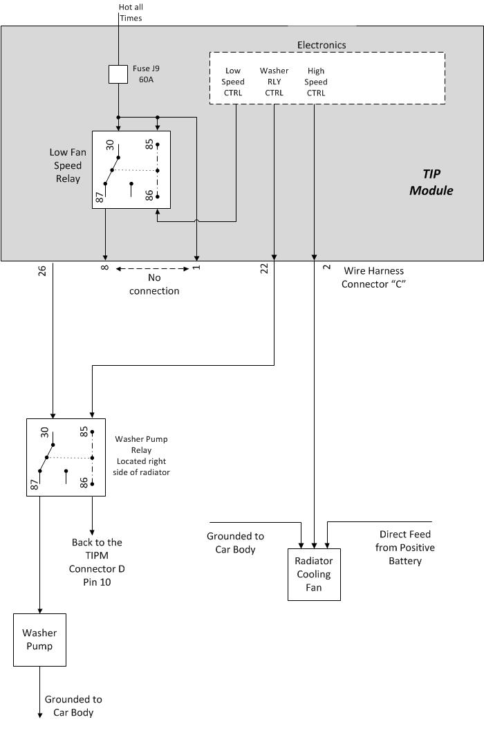 3. So as for the cooling fan itself. Well, there is three wires on the cooling fan module. One pin is a direct feed from the positive battery. Another Pin is connected directly to ground and the third pin routes to the TIPM, Connector C, Pin 2. According to the Wire Specs, this Pin 2 is the High Fan relay control.