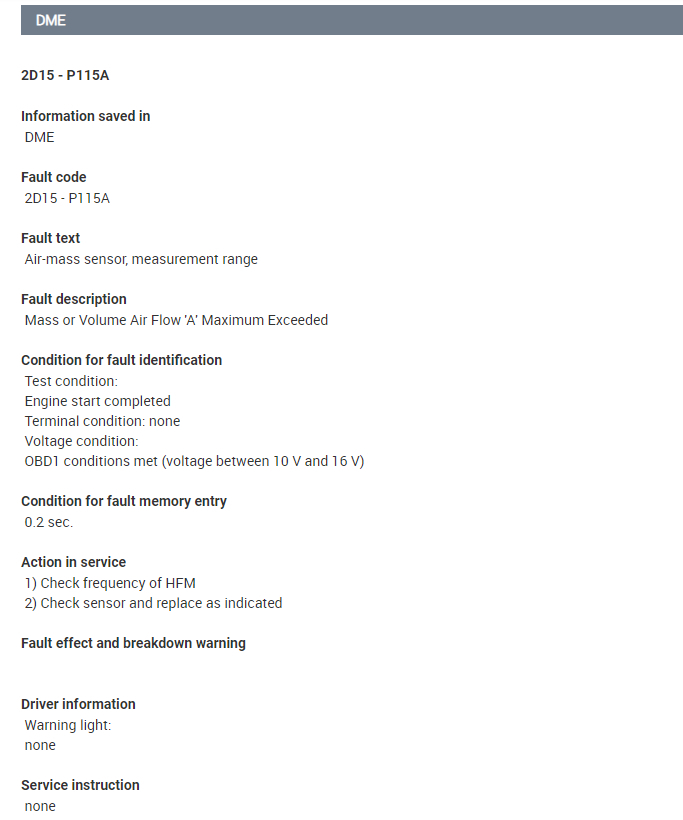 So if you have oil in the intake then that is most likely the cause of the MAF to fail and set these codes. We do not have a manual on the N47 engine but these codes are basically the same for the N52 so I added the info below for this.