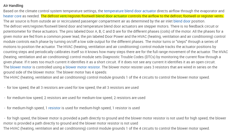 As for the parts, I don't show any OEM part numbers which would make this easier. According to some large parts websites, these actuators are the same. They only list a couple different options for dual temp zones. This is very common for the OEM to use the same actuator for each door because it cuts down on complexity.