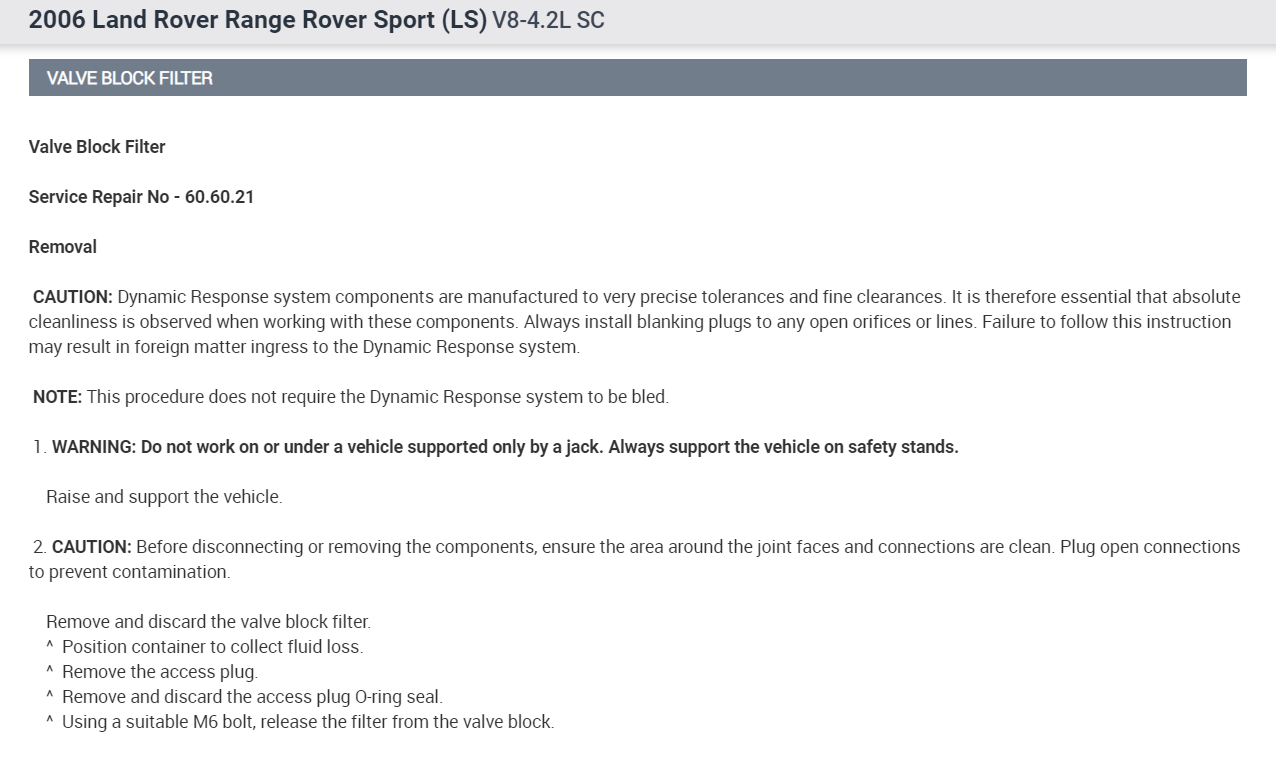 no, sorry, I do not even see a valve block filter as pictured. The car has an aftermarket Hitachi compressor. I Had a local shop, (most won't touch a range rover) remove and replace the middle valve block with a new one per a Land Rover mechanic instruction, three valve connections, he said simple no reprogramming needed. The shop is not interested in diagnosing the problem. When I try to raise the car the suspension fault stops the raising. I clear the fault by turning off the ignition and if I hold the raise button pushed it does not fault. Unfortunately, the fault appears on the dash