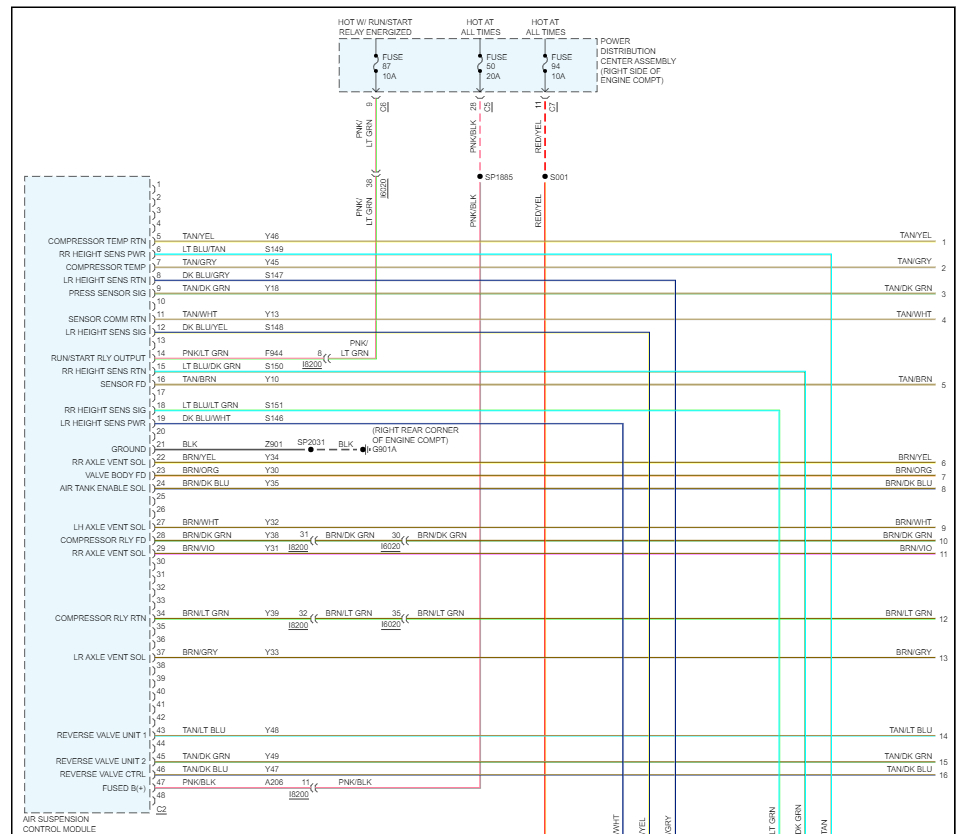 Does the pink and lt/grn wire at the air suspension control module have power when the key is on?