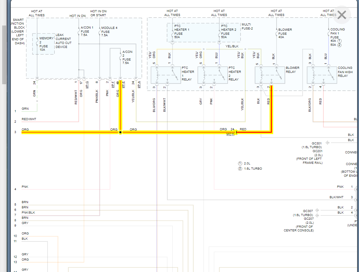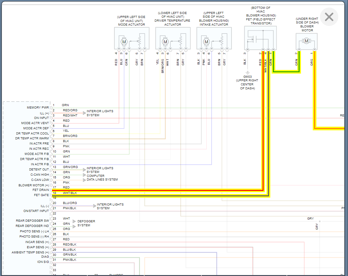 It also provides the ground for the two relays prior to the blower motor relay which means the control module is most likely causing the blower motor to stay on.