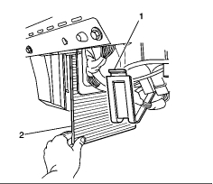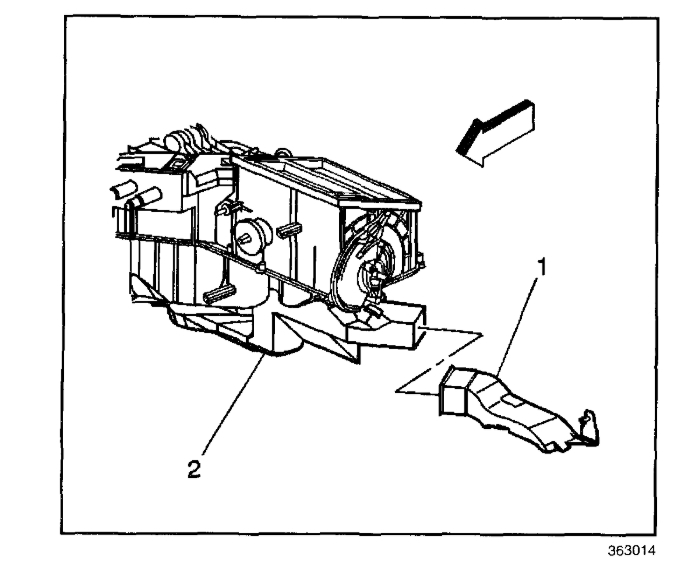 1. Remove the floor air outlet duct extension (1) from the floor duct (2).