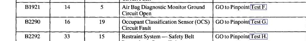 The Restraints Control Module (RCM) checks the Occupant Classification Sensor (OCS) circuits for faults. If the RCM detects one of the following faults on any of the OCS circuits, it will store Diagnostic Trouble Code (DTC) B2290 in memory and Flash Lamp Fault Code (LFC) 16 (or higher priority code if one exists) on the air bag indicator.