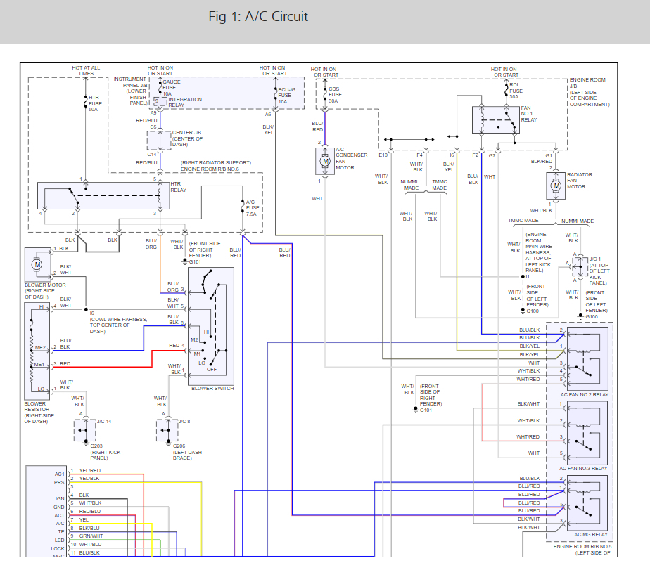 I have a circuit diagram of the electrical system for a RAV4 which seems identical except for in my system there is no 'conventional' magnetic clutch relay (the wires that enter and exit this on my car go straight in and out of the cabin fuse box so I presume it is controlled by a semiconductor fuse inside this).