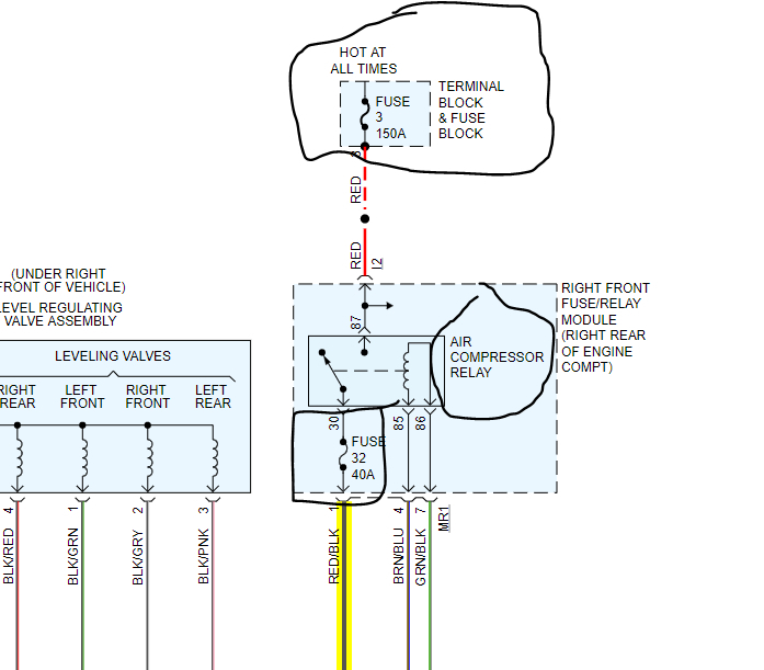 Recently bought the car listed above from a guy who told me the car had some issues. He drove the car with a bad alternator and was over voltage the system until he parked it. He got the passenger fuse box under the hood replaced and the one under the rear seat. This was not done by a MB mechanic however which worried me. He also explained that the battery drains over time and was not sure why so he put a shutoff on it to prevent it from draining. The biggest problem? Airmatic system does not get any power. Both relay and fuse do not get power but every other fuse and relay works fine minus those two.