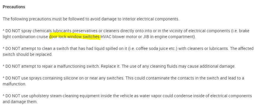 Let me know. Also, when you removed and replaced the door lock actuators, did you use any type of cleaner, lubricant, or anything that could have provided overspray in that specific area? See the list below.