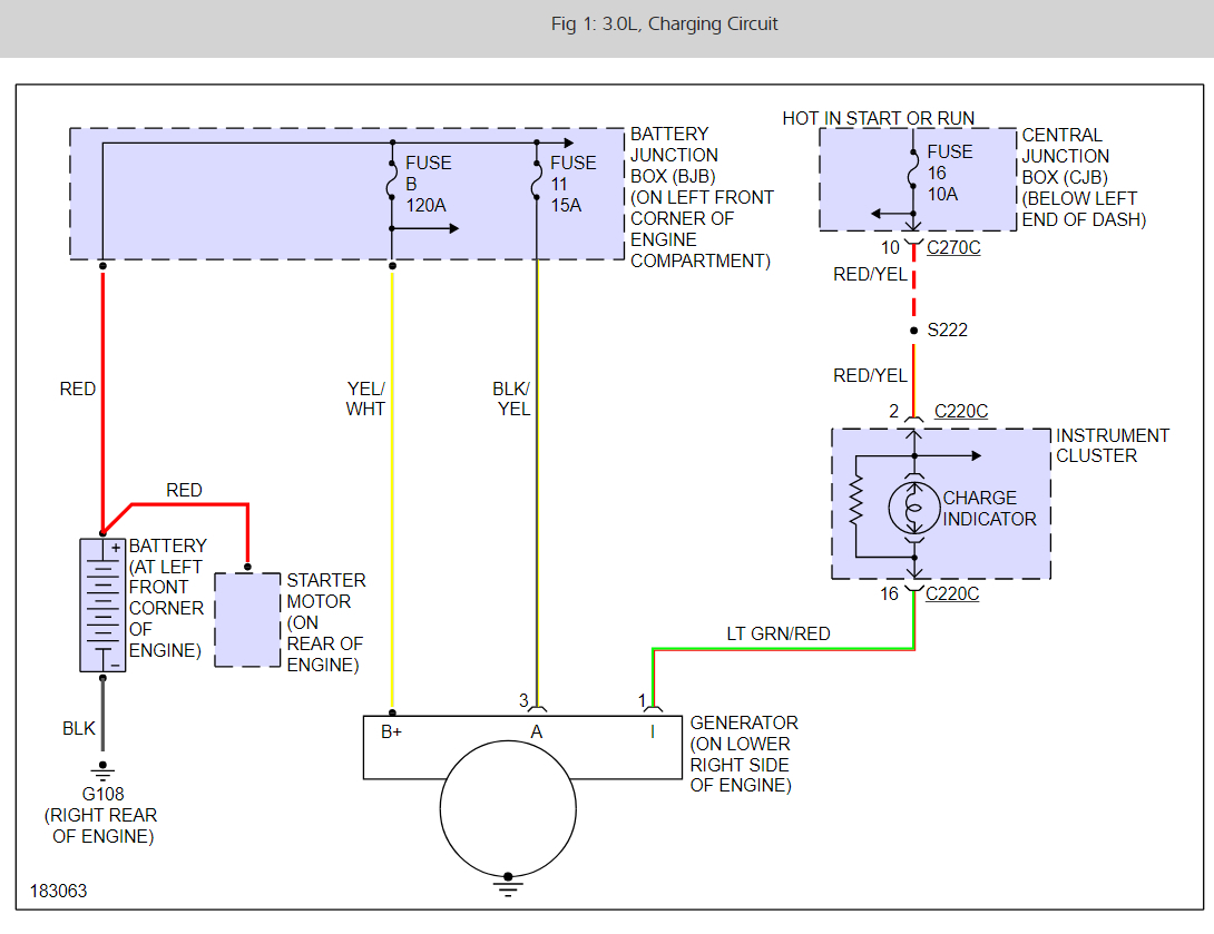 When replacing alternator it fell and pulled out two of the wires out of the 6G generator connector. The brown/red in terminal three is still there. The green/red and violet wires are the wires I need to know which terminal they go to. The brown/red goes to the battery junction block, fuse #6. I think the green/red is for the indicator light but do not know which terminal it goes to.