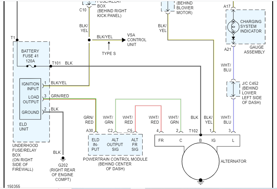 Let me know. Also, I attached the wiring schematic below for the alternator circuit. Take a look through it and let me know your thoughts. One other thought. Check the ELD ground on the right rear of the engine. It is a black wire. (ELD stands for electric load detector).