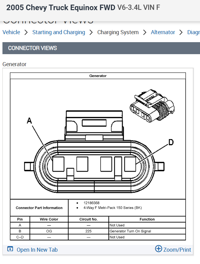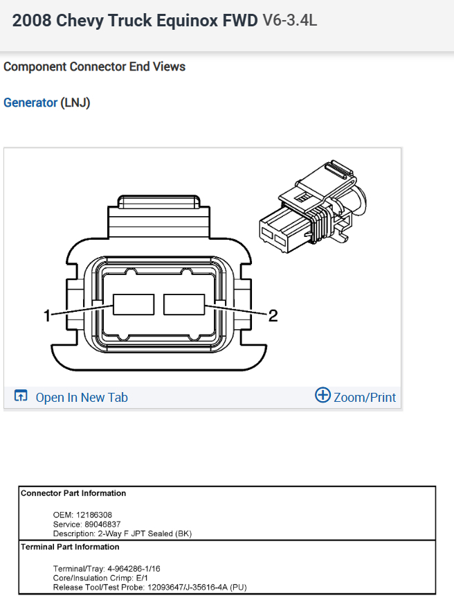 Hi guys. So, I bought this vehicle listed above and the alternator went out. I accidentally ordered an alternator for a 2008 Equinox. I was wondering if I could get the Pinout diagrams for 2005 and 2008 alternator Electrical connectors and the alternator wiring diagrams for both years as well, in case I have to swap electrical connectors. I know it is just two wires, but I don't want to pop fuses if I guess wrong. Thank you.