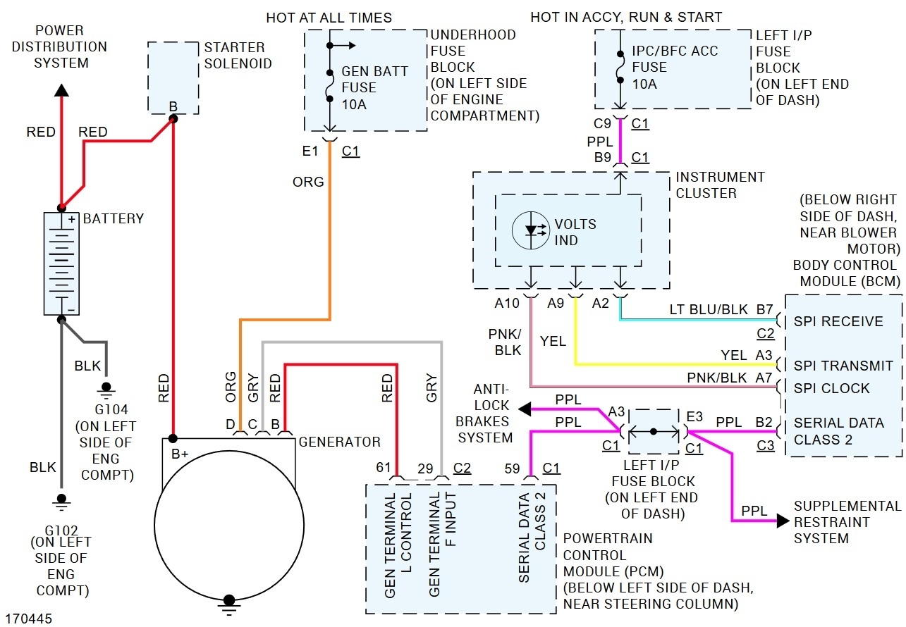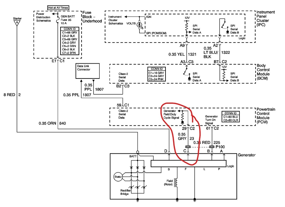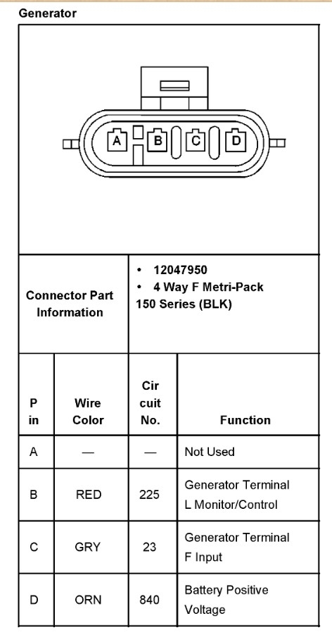 There should be a large red cable that connects to the battery stud. Then orange, gray and red wires that go into the connector for the alternator. The D wire is a feed to the alternator that tells it the system voltage at the fuse box. The gray wire is the Field control wire, it tells the alternator when to charge. The L wire is the circuit that tells the PCM if the alternator is charging and turns on the light in the dash if it isn't. There are 4 pins in the alternator but only 3 are used. The first thing would be to have the alternator tested. Then if it is the issue, replace it.