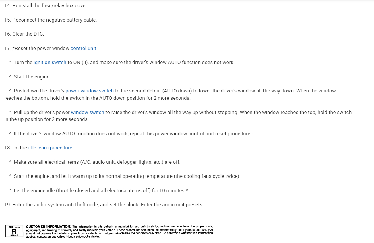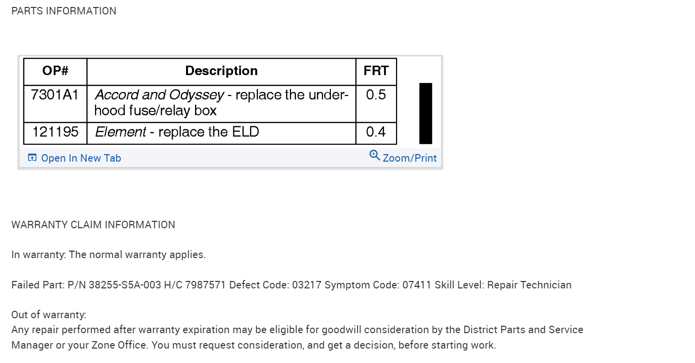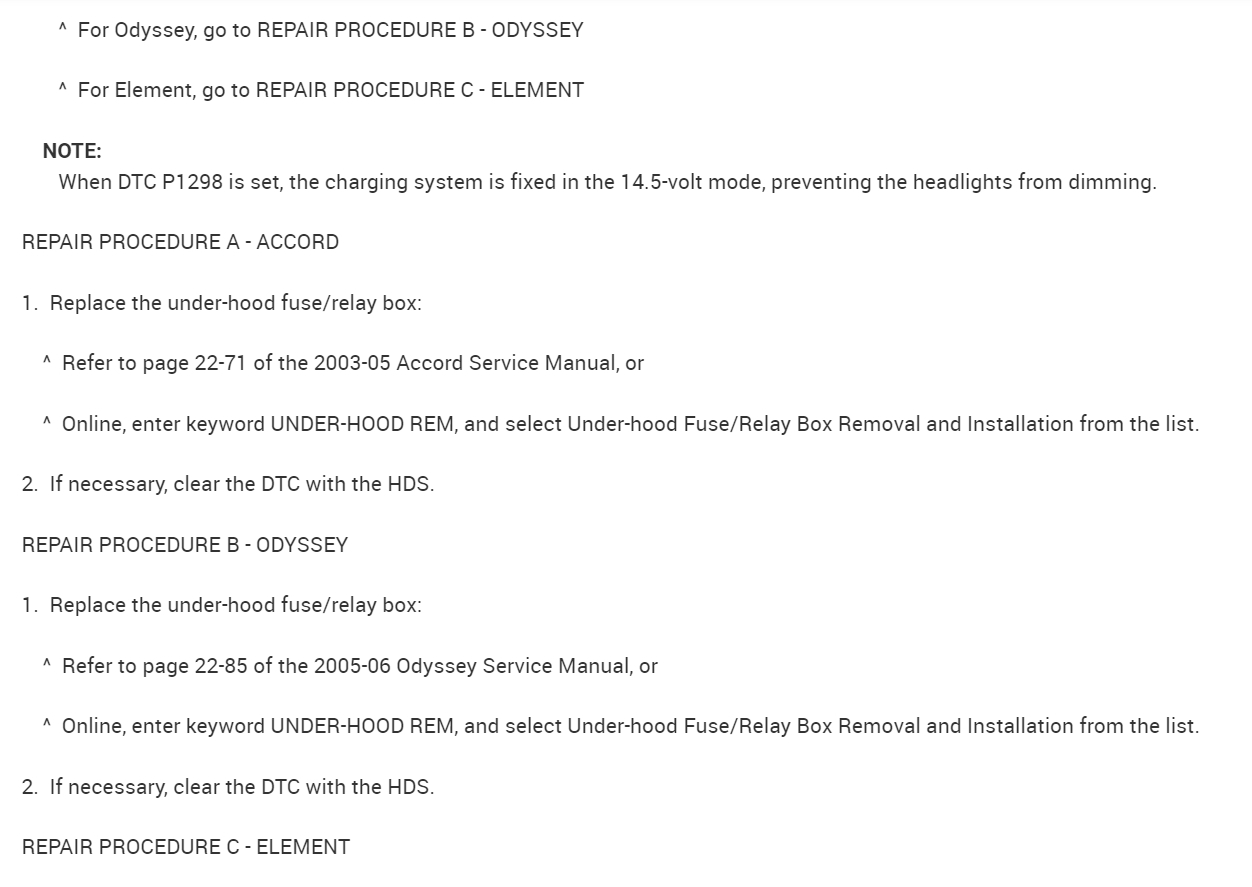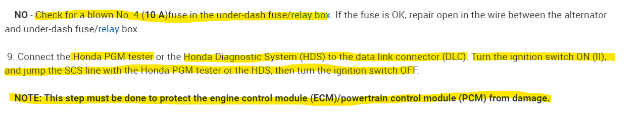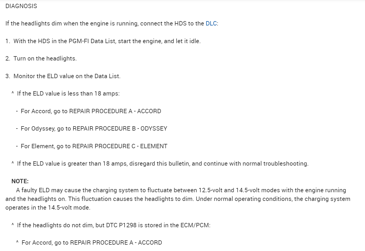 I was just looking at the ELD, there's some basic tests to check its wiring to fuse 4 under the dash (pin1), its middle pin(2) which is a ground and the 3rd pin is the data pin to the ECM, but there are 2 different codes that would usually set with a failure of that component, the trouble is you're having to recharge the battery so much. All the service information is stating "check ELD data with Honda hds, and to use an amp clamp to verify current flow. There aren'tt any basic tests besides checking power from fuses, and if the eld was to set a code we wouldn't know because the computer's memory has been cleared by the battery being unhooked. There's a code P1297 eld circuit low voltage and a P1298 eld circuit high voltage. Each procedure starts with check eld data list with Honda hds or pgm tester. It's frustrating, unless you're a Honda technician, we won't have access to these scan tools. I think if it was a failure of the electric load sensor (eld) you would have had a check engine light on at first, and as battery voltage dropped off, the other symptoms you mentioned would follow. I will post the Flow Chart for the charging system just so you can see what I mean. But I don't want you to jump out any of these ECM circuits.