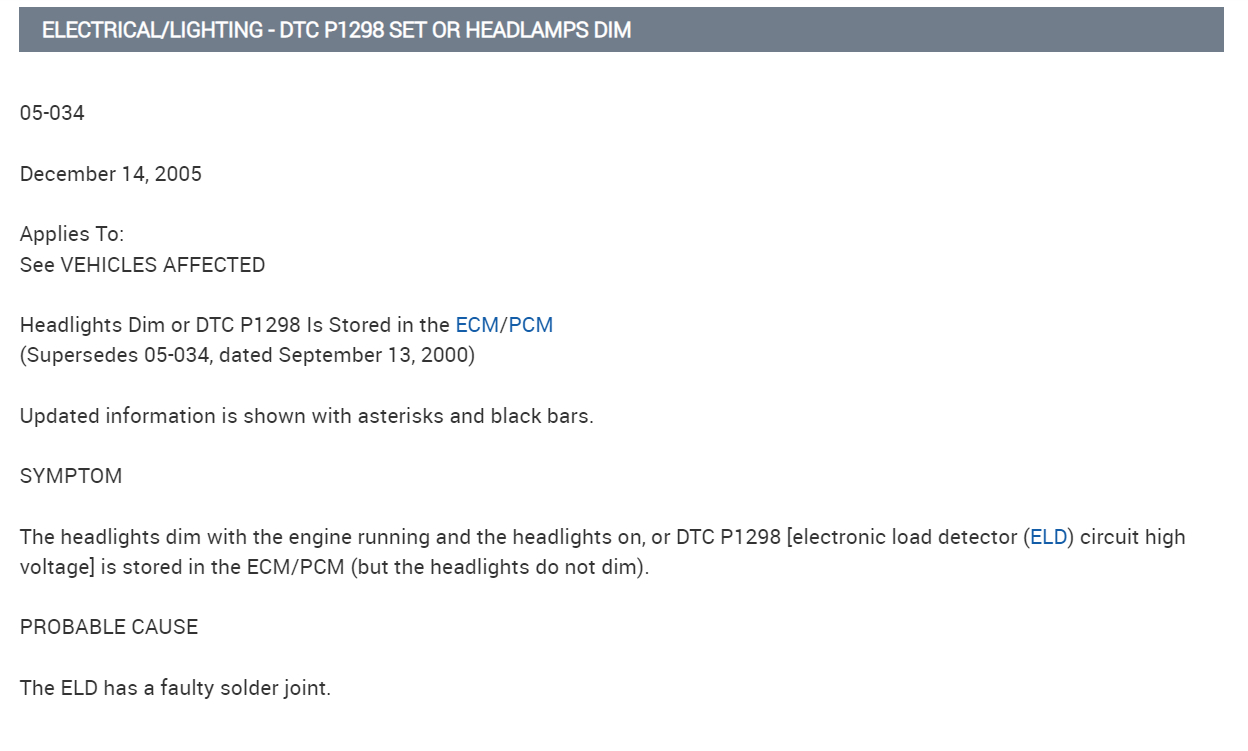 There is a TSB on the electrical system and the eld, but there is a code involved, Ill post it below. But there's always a chance of a bad Alternator, I know it tested good, but there have been a lot of bad parts lately.