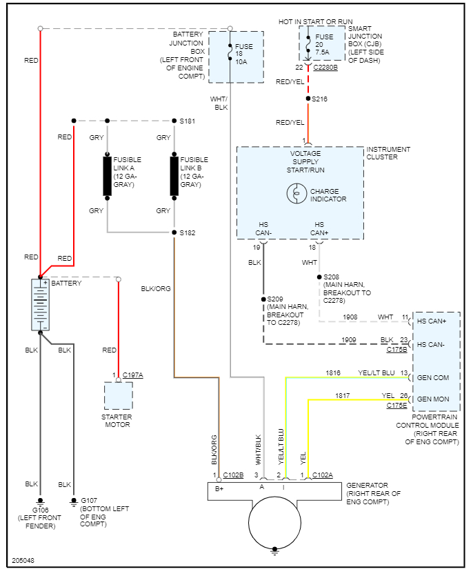 Thank you for the diagrams. I haven't had time to do the wire testing cause this alternator is in an awful position and it looks like the best way will be to take the alternator and drop it to get to the wires . anyhow I seen a wire down in the general area the has a aluminum wrap it has no loom around a good bit or tape and I was wondering does this single wire have anything to do with it? I know battery and alternator are good I just took a 900 mile plus trip from Tennessee to Maryland and back no issues, but car rpms ran high 3 to 5 k while getting up to 70 struggle to get to it once there cruise control maintained pretty well. I been looking to find fusible links I found one but that was it. belt is good tensioner is tensioning but I hope to drop alternator soon .I will def get back and post what I find. I did find someone wired from starter to fuse under dash here a wire in the ignition was loose an once get it working right was able to eliminate that ,but if you come across any ideals that might help I am all ears. thank you for your guidance I been a Dodge guy until now sorry this is so long.