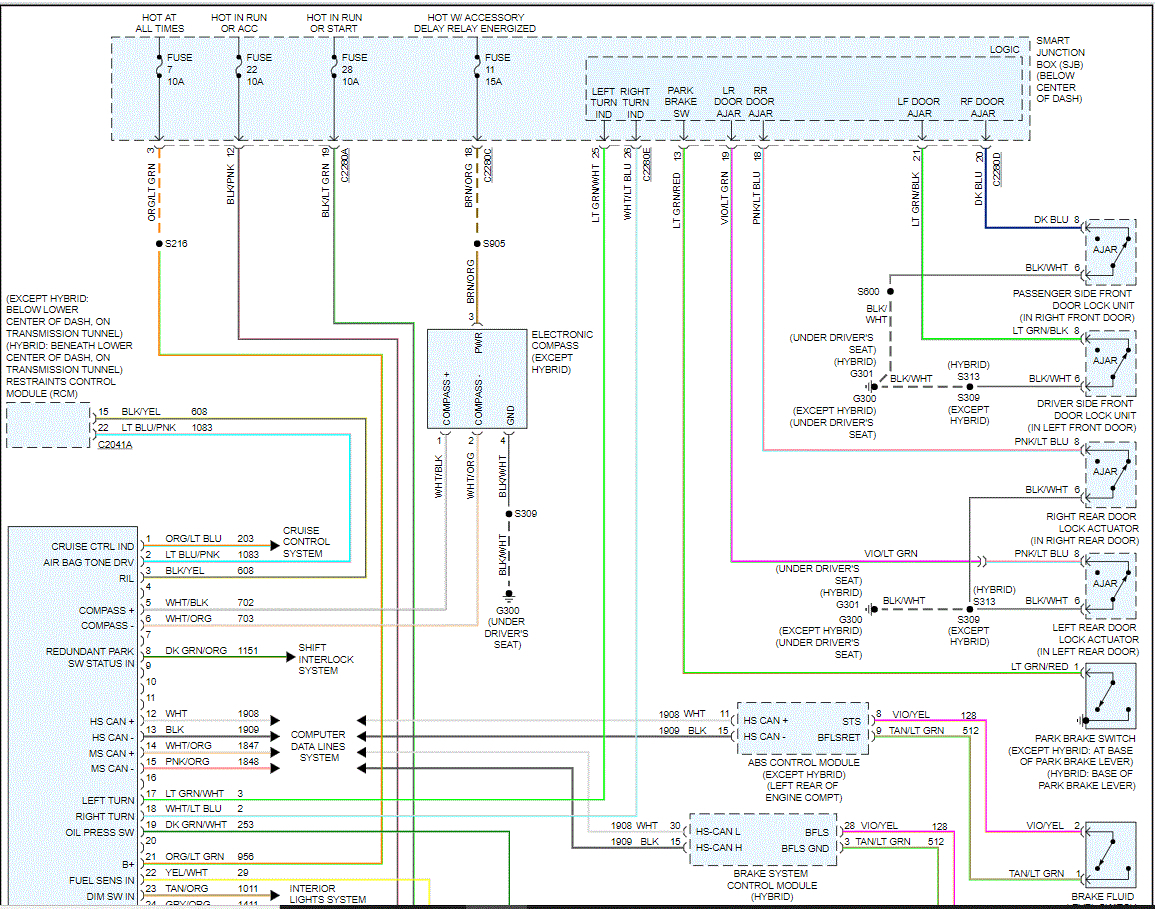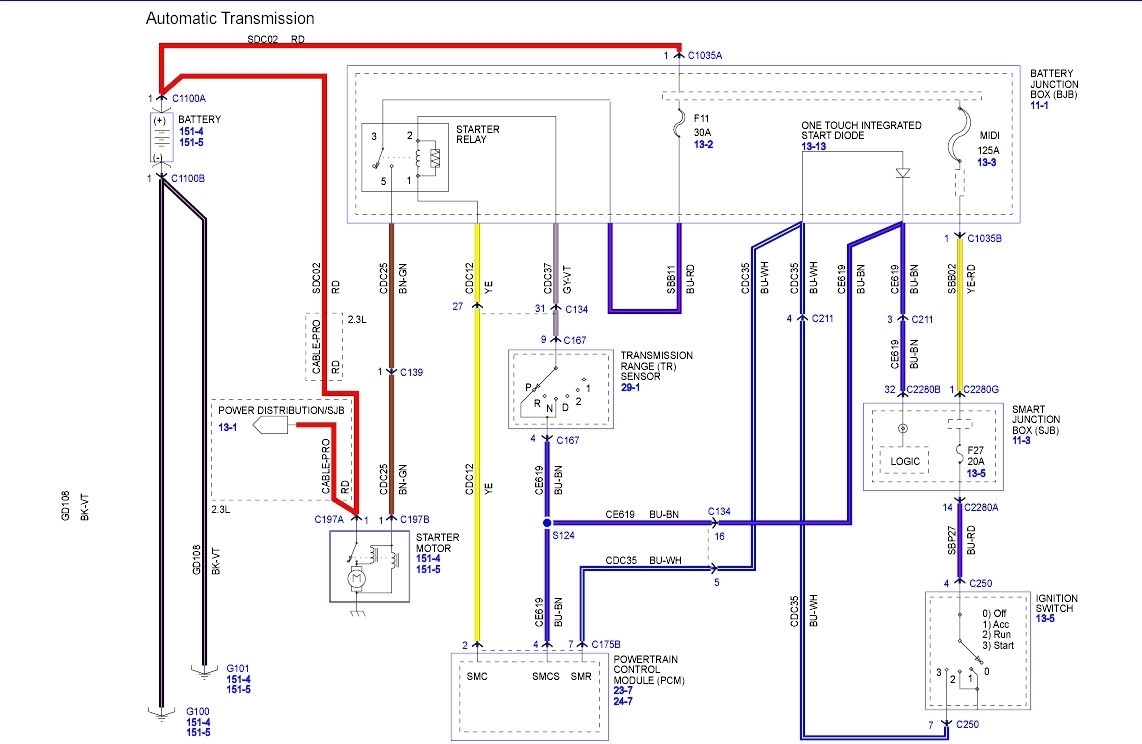 The passive anti-theft system (PATS) transceiver receives voltage from the smart junction box (SJB) fuse 5 (2A) on circuit 296 (WH/VT) and is grounded on circuit 570 (BK/WH). The PATS transceiver and the powertrain control module (PCM) communicate on circuits 167 (BN/OG) and 168 (RD/BK). The PCM compares the key code stored in memory and enables the starter if the key code is correct.