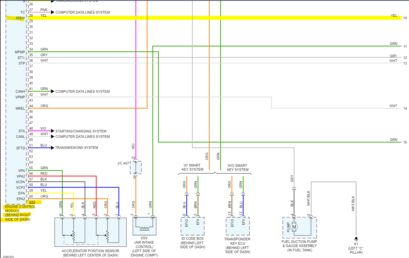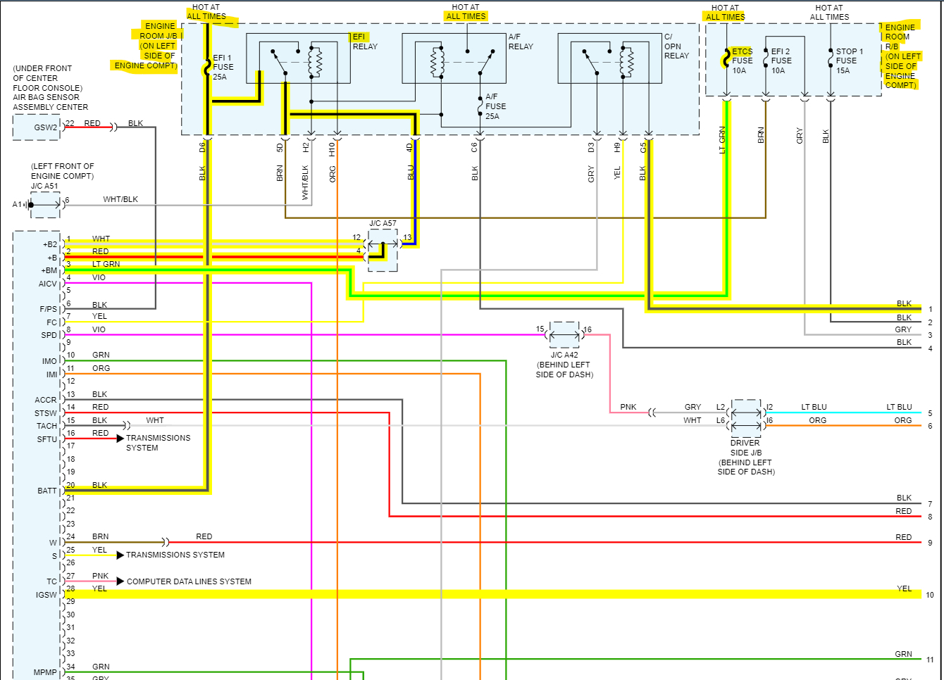 Hello, do you have the Check Engine light come on when you turn the key to just the On/Run position? If so, do you know if you're missing ignition spark? I'll post the wiring diagrams that power up the ECM. Toyota doesn't call it an ASD relay, they call the ECM power relays an EFI relay, and A/F Relay and the C/Open Relay. but you'll see all these on the wiring diagrams.