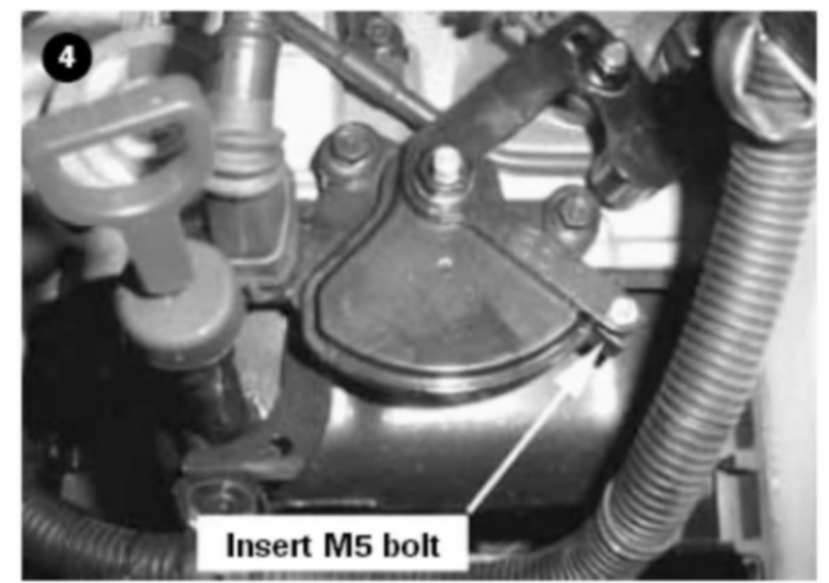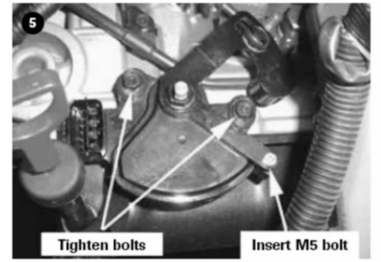 7. Insert a 5 mm drill or M5 (5 mm) bolt in the adjustment hole of the range switch. Tighten the two 10 mm mounting bolts to specification.