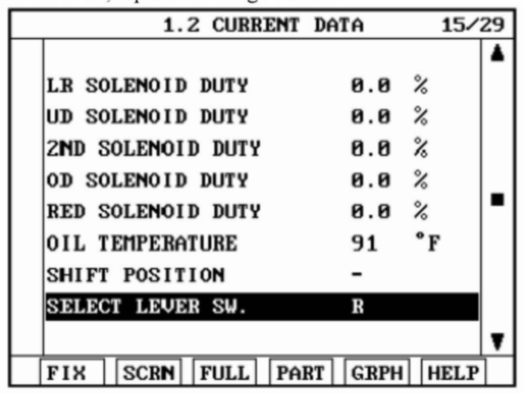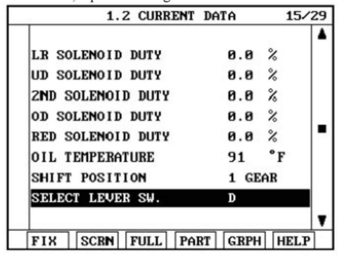 ^If "D" and "GEAR 1" are displayed, the TCM is receiving the correct signal from the range switch. Go to Step 12.