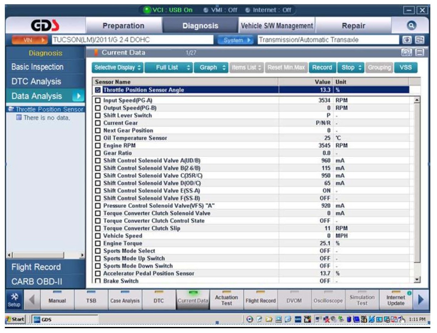 1.Attach a GDS and select VIN and A/T menu, Current Data and Throttle Position Sensor.