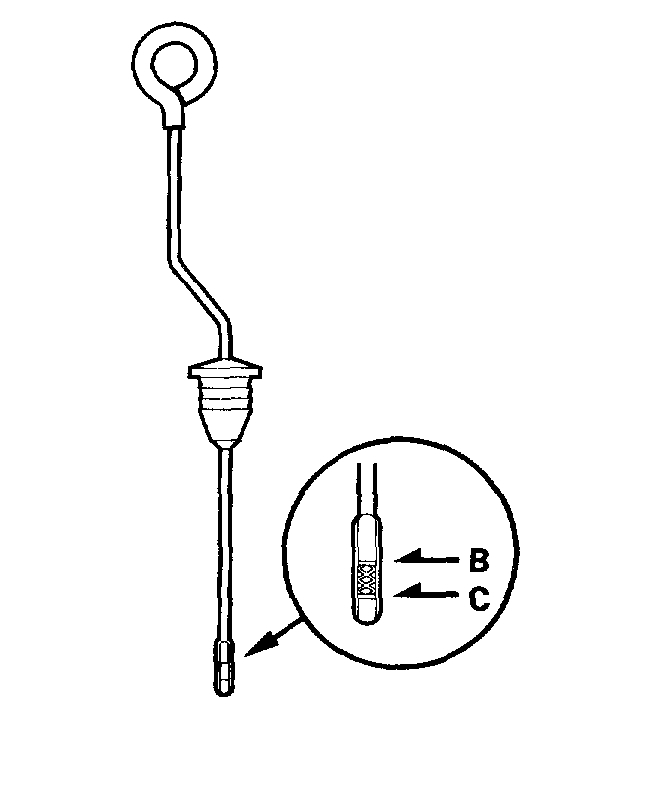 5. Remove the dipstick and check the fluid level. It should be between the upper mark (B) and lower mark (C).