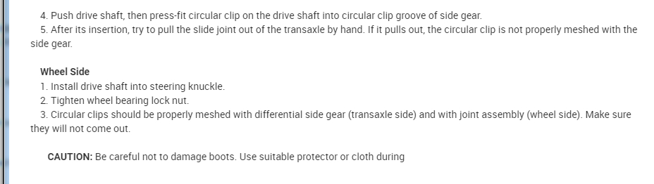 Internal inspection of transmission shows nothing. To my eye the snap rings on old axle and purchased (after market) axle stick out of the slot they are in and are not completely round. Purchased two snap rings directly from Nissan. They are perfectly round, but it is obvious that they will be sticking out. What should they be? and any tips for successful reinstall.