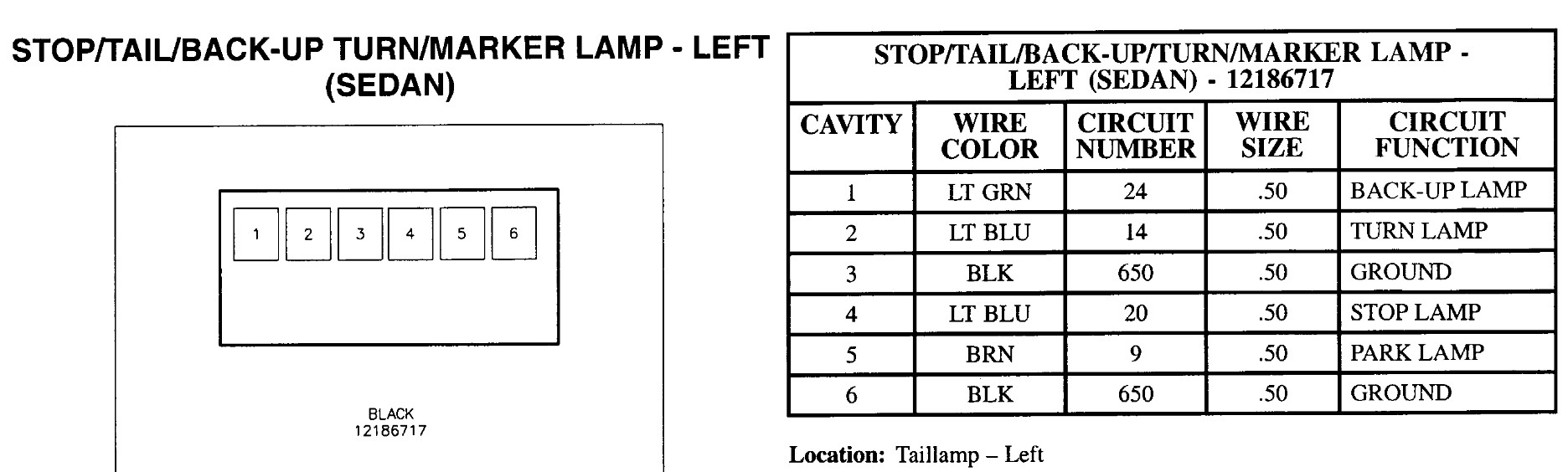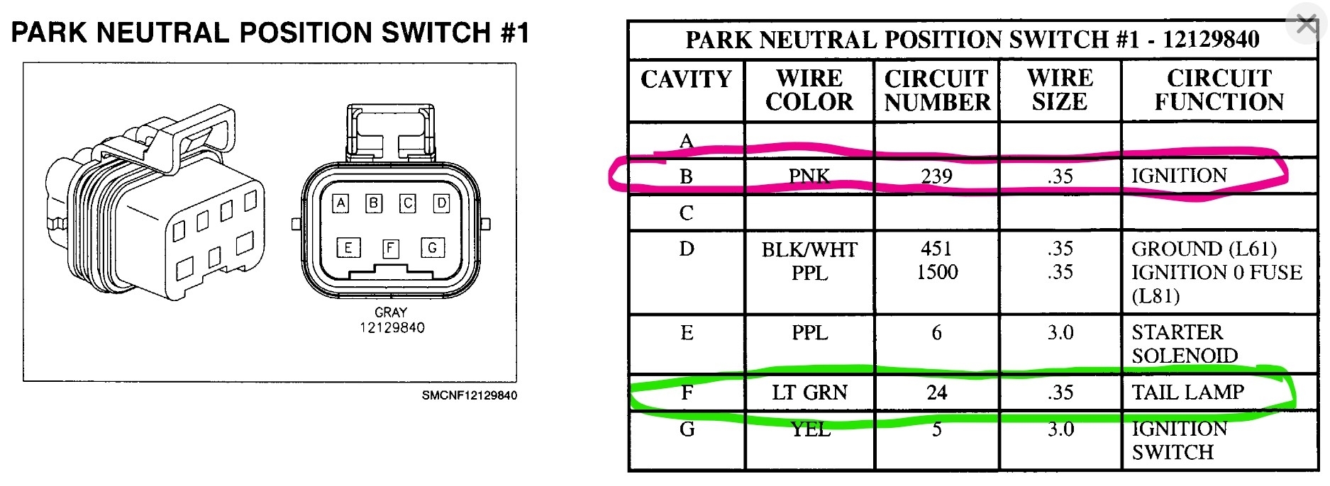 Now go to the fuse box and use the light to verify that the fuse is good. With the key on the fuse in the junction block under the hood it should light up on both sides. Next go to the top of the transmission and find the shift cable. The range switch is just below it. Remove the larger connector from the switch and with the key on touch the test light to pin B, which is the reverse light power feed pink wire. If the fuse is good and the wiring to the switch is good the test light should light. Now to test the rear lights and wiring and determine if it's a bad switch just use a short jumper wire to connect terminal B to terminal F. F is the center pin in the row of 3. Now check, are the reverse lights on? If yes then it's likely a bad switch, if not then we need to test farther. For now, we will say no, the lights didn't come on. Leave the jumper in place, turn off the key and go to the left rear taillight and unplug the large harness connection on it. Turn the key back on and use the test light to check for power on pin 1 (light green wire). If no power the wire is bad between the front and rear. If you have power but still no lights it's possibly a bad lamp assembly, however since it's both sides that are out it's more likely the fuse or the switch.