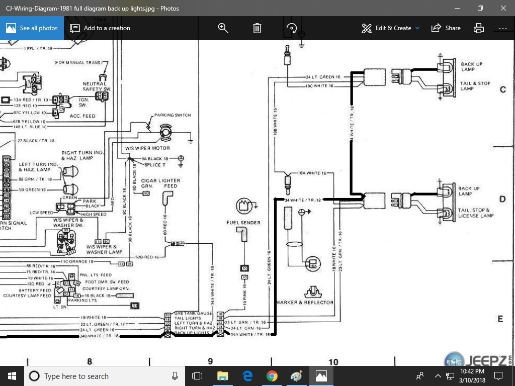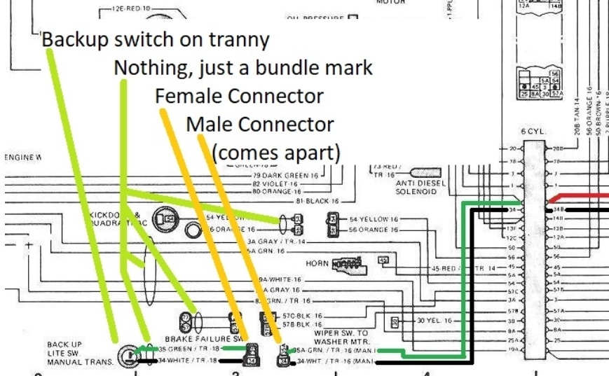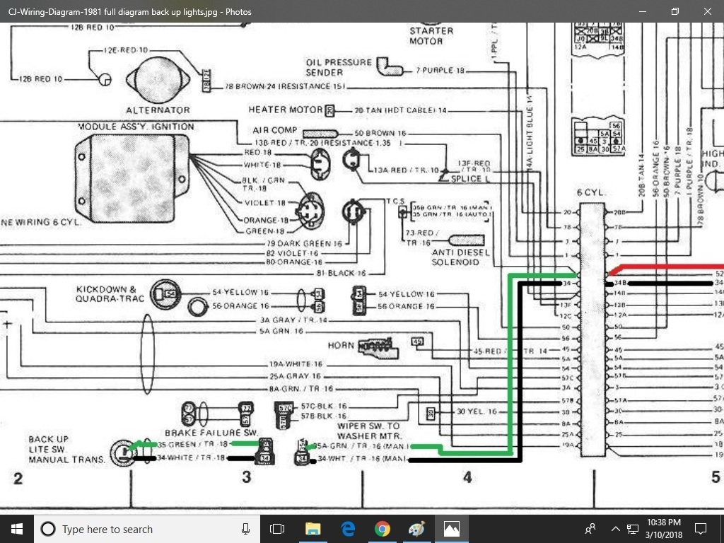CJ MEDEVAC,Thank you for the whole diagram. I will need to study it close, but at quick glance I did not see the backup light switch. My vehicle was stripped of the wires to and from the backup light switch by the previous owner, so I need some help. I do not know where the wire would come from and where it might tie in. The switch sits right on top of the transmission. Any advice would be greatly appreciated.
