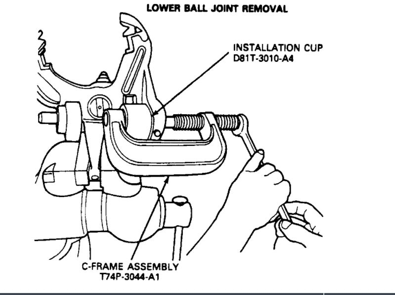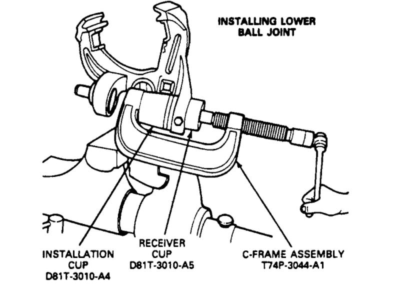 1. To install the lower ball joint, assemble C-Frame Assembly, Ball Joint Receiver Cup (D81T-3010-A5) and Installation Cup (D81T-30 10-A1 and D81T-3010-A3) or equivalents inside cup (D81T-3010-A4 or equivalent) in position on the spindle. Turn forcing screw clockwise until ball joint is seated.