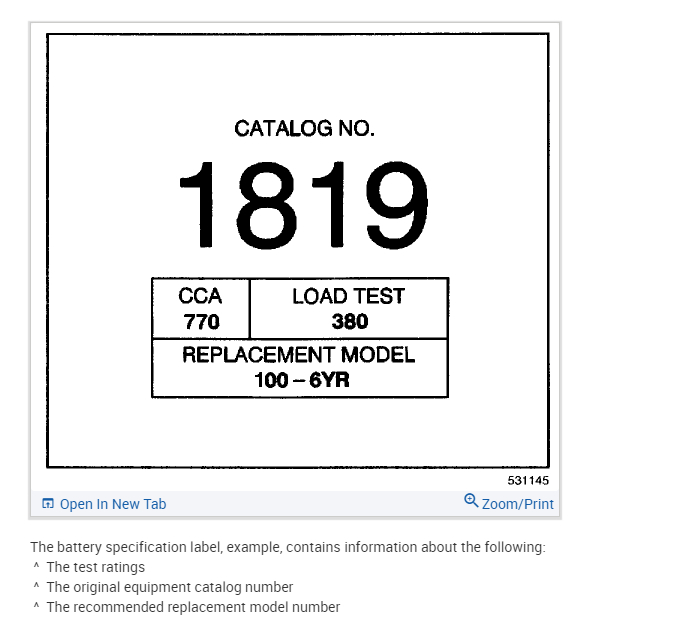 Looks like this is a group 78 battery and the factory rating is 770 cold cranking amps. You can go larger with the CCA but I would try to go smaller unless you live a warm climate year round.