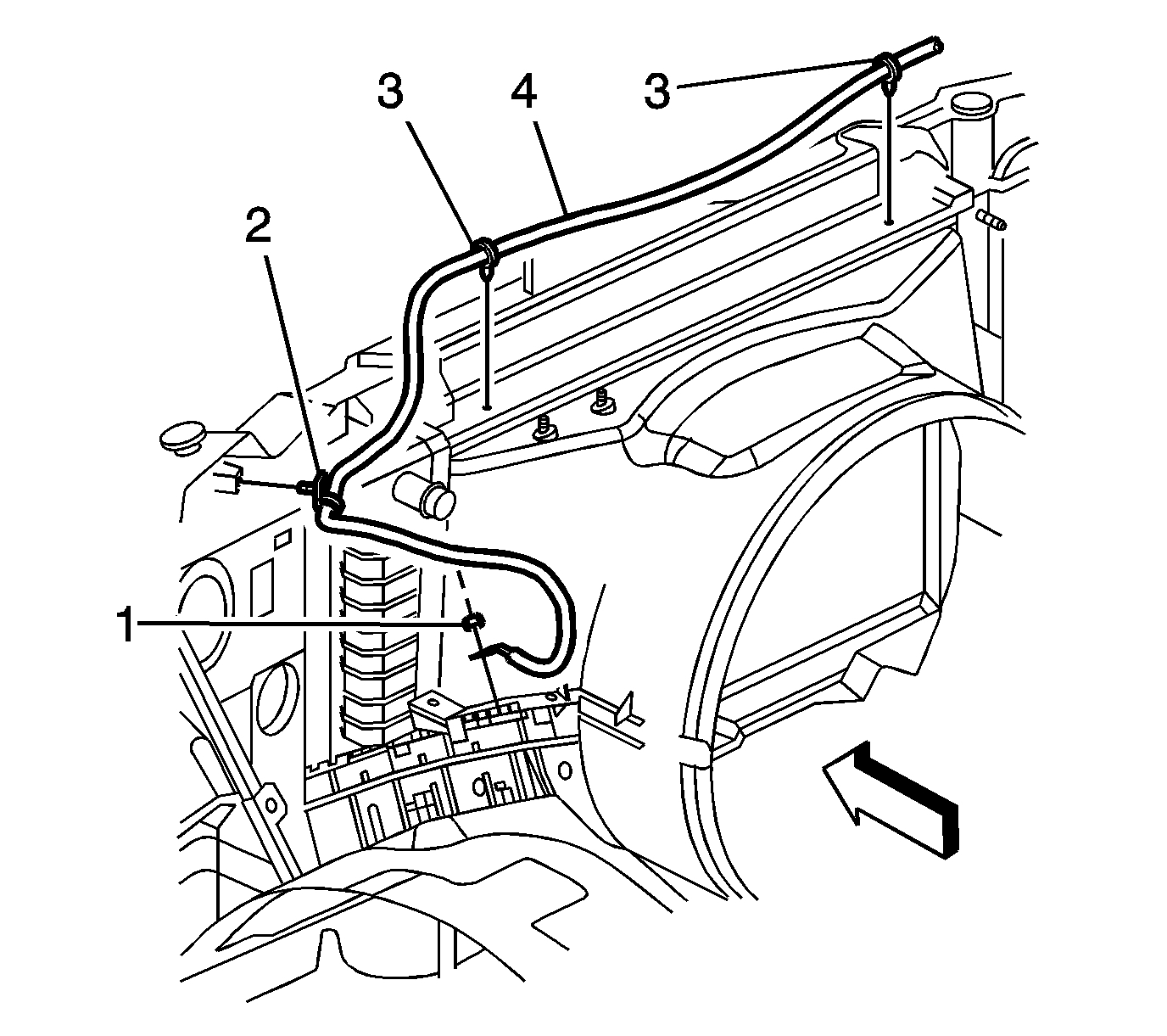 2. Install the positive battery cable clips (2 and 3) to the fan shroud.