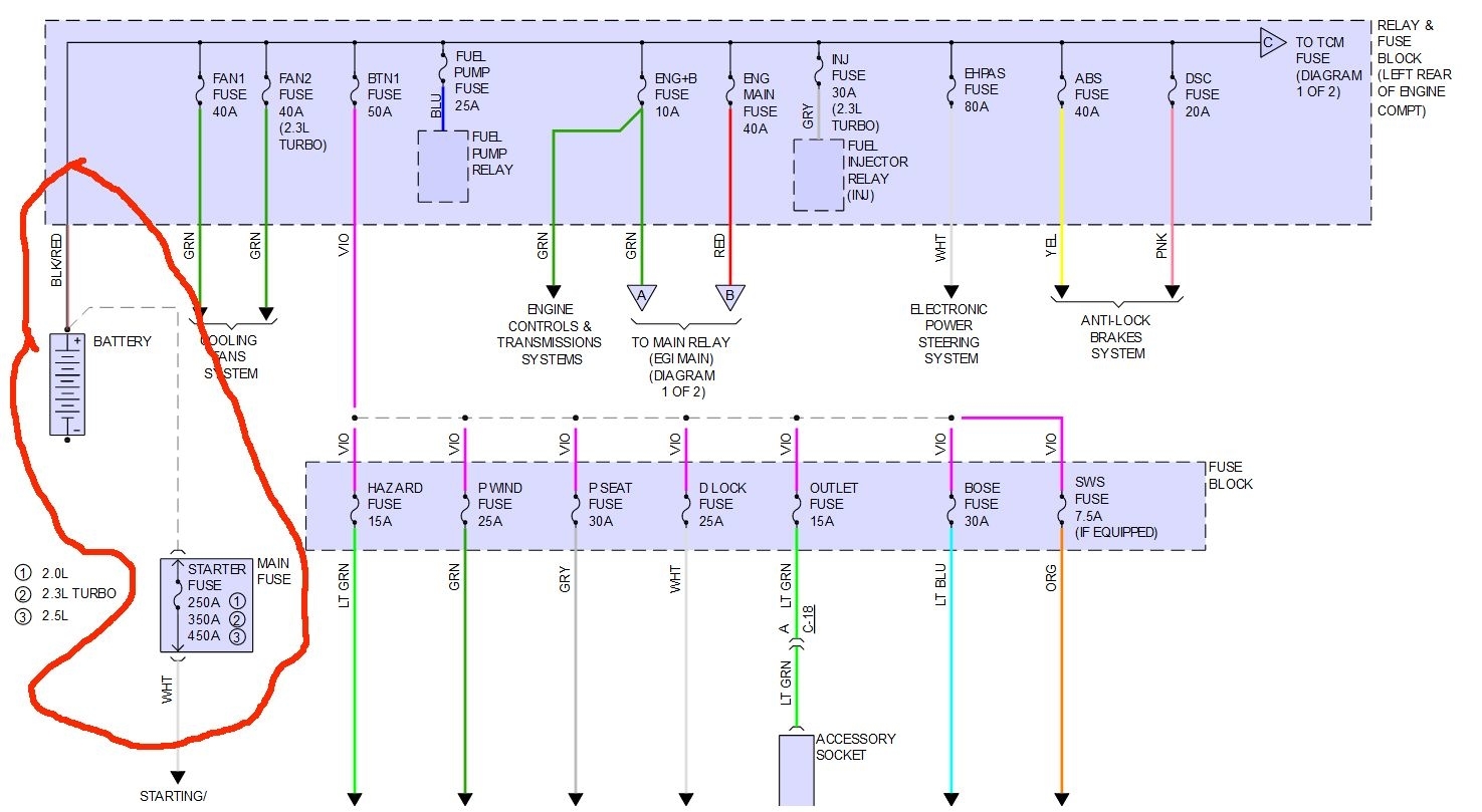 Here are three wiring diagrams, one aftermarket and two factory diagrams. they show the main fuse with the white wire and the black/red stripe on the positive terminal. The other cable will be solid black and go to chassis and engine ground.