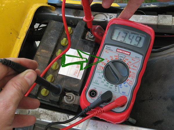 First off you will need a digital Multi-Meter (picture below). You will turn the meter to 20 volts scale (see picture), with vehicle running touch red lead to positive battery post and black lead to Negative post (see picture). And as stated voltage should be between 13.5 - 15.1 maybe as high as 15.5 volts