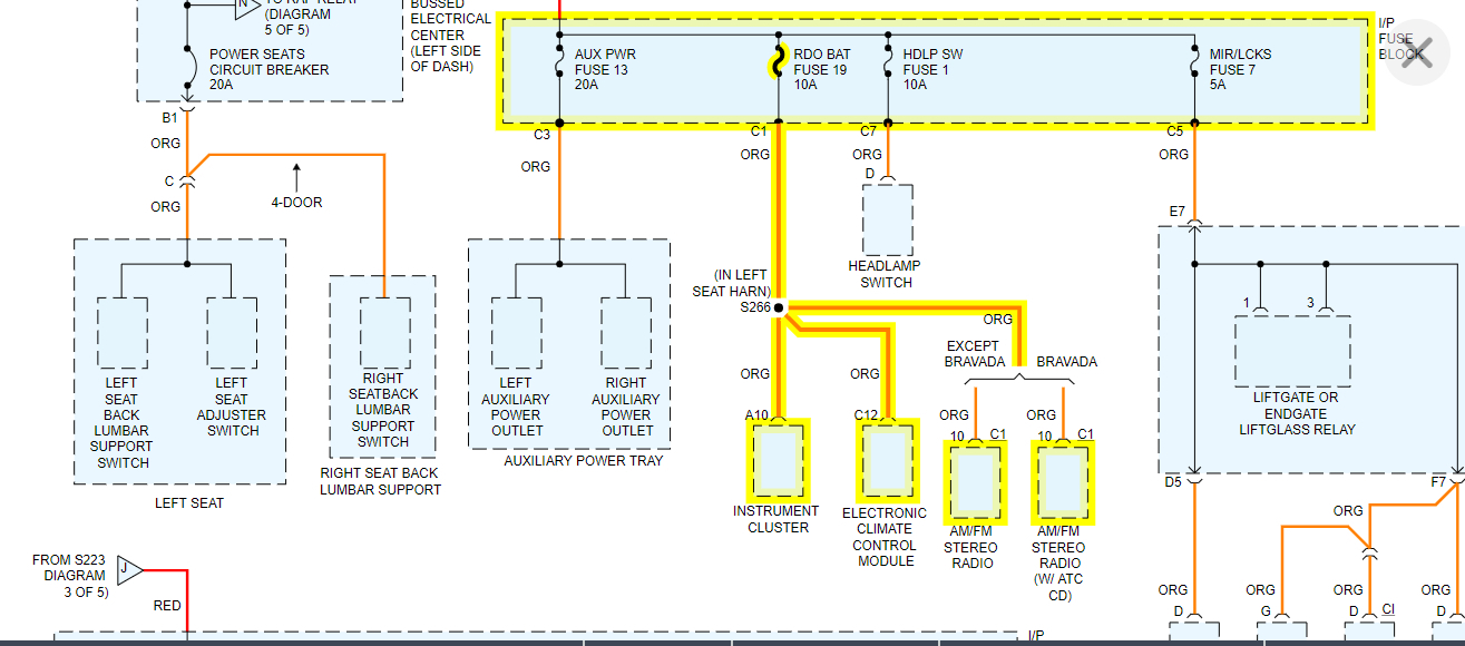 My bad, I was interpreting the diagram incorrectly. This might be a location definition for junction 266 showing all items are in the "left seat harness" where ever that might be. My climate control is the old fashoned knob adjust not electronic control. I have eliminated the radio so this leaves the instrument cluster. I would assume this has an electronic control for all and I guess this would be IN the instrument panel. I will look into how this is connected at least there is no flexible cable going up to the speedometer to disconnect.