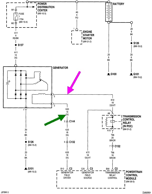 The better suspect is the dark green control wire is grounded. Start by measuring the voltages on the two smaller terminals on the back of the alternator. This has to be done with the engine running. You'll find full system voltage on one of those terminals. The other one should have less, but not 0 volts. The lower this voltage is, the bigger the difference is, the bigger the electromagnetic field is, and the more output voltage and current you'll get. Normally you'll find this one is between about 4 - 11 volts.