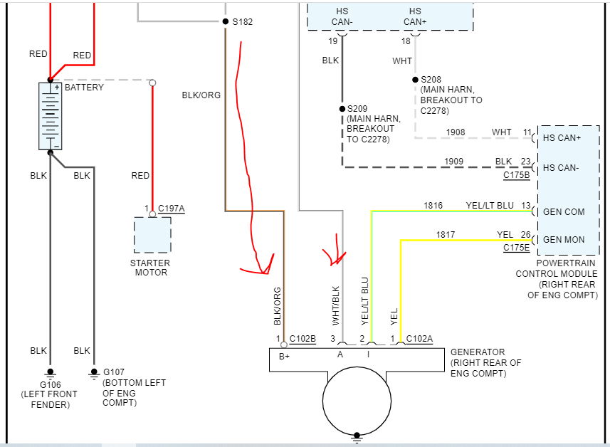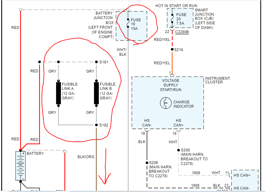 Next, check fuse 18 in the battery junction box. In addition, confirm there is power to and from it. If there is, then go to the alternator and locate the white wire with a black tracer. Check that for power as well.