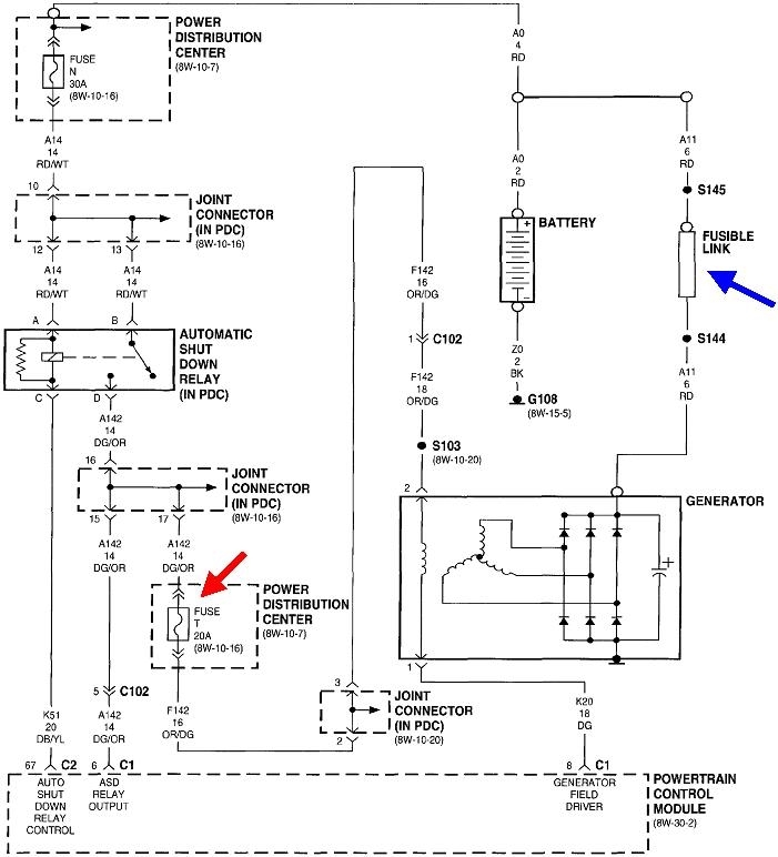Fuse "T" is in the Power Distribution Center, (fuse box), under the hood. It's shown with my red arrow in the diagram. This fuse has to be good because it feeds other circuits for the injectors and ignition coils. If it was blown, the engine wouldn't run.