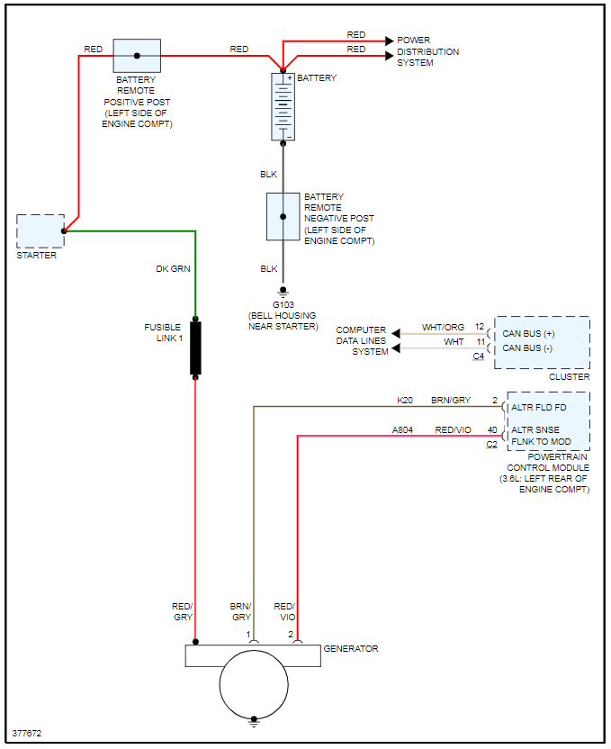 Meaning we need to hook a scan tool to see what the alternator sense circuit is reading. If we have high resistance in this circuit then the alternator will charge to what it is told to do by the control wire (brown/gray) but due to the high resistance in this red/violet wire the PCM thinks it is not charging the proper amount. So then the PCM will tell the cluster to turn the light on.