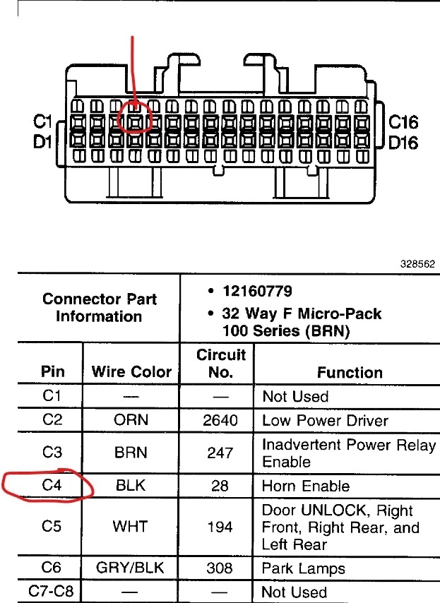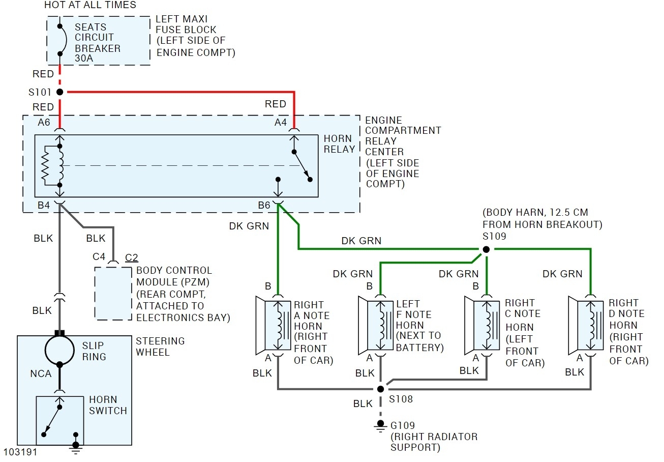 The BCM wire is a black wire at pin 4 in the brown C connector on the BCM. While the horn is connected to the BCM on that car, it is for use with things like the panic and lock notes, not primary horn control. If the horn isn't sounding, then you will want to look at the horn relay and the rest of the horn circuit. The attached is the schematic for the 4 note horns, the 2 horn system uses the same circuit, they just didn't install the F & D note sounders. The horn relay is in the under-hood relay center.