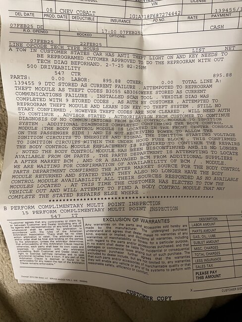 I’m at the dealership to let me know that I got the car started without purchasing a BCM. That they didn’t bother to do anything to the car. Especially, when I mentioned about the grounds and shorts, but they should’ve known better being they know what are the main issues for their own vehicle. Like you mentioned, red flag wanting to replace something that was having a power issue. When the BCM has many. I don’t expect to get the full amount. I am being fair and aware of the cost to have the key re-learned and I was told if it didn’t fix the problem I would still have to pay for the service. Which was told to me $225 but for the diagnostic $195 for the total of $895.88 minus the $225 $677.27 at least can be returned.