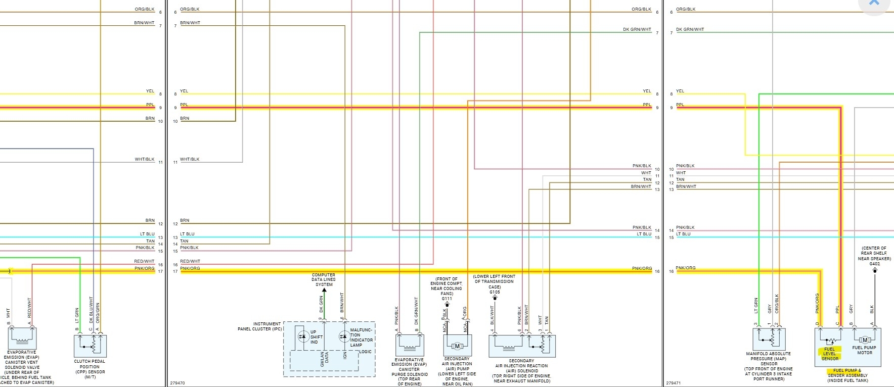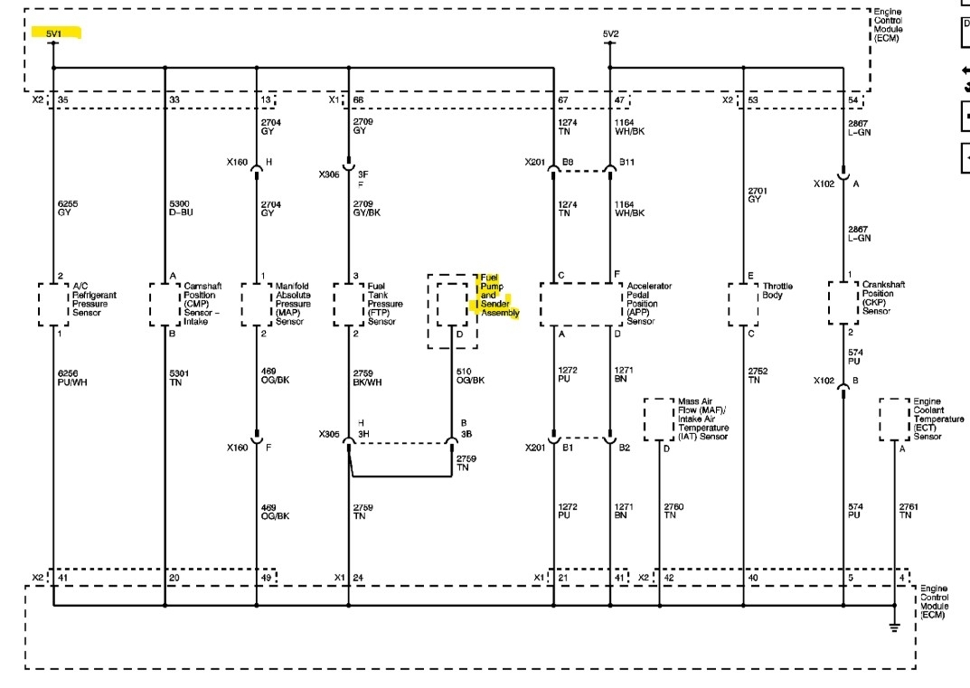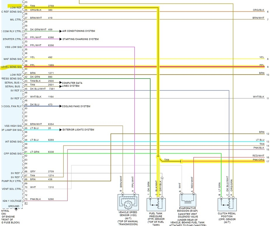 Sorry I had to read your posts again to catch up, been through a lot of vehicles lately, So, the dealership is returning most of what they previously charged you. But still no Speedometer and gas gauge? The fuel gauge code P0463 (Fuel Level Sensor circuit High Voltage) on the OEM wiring diagram shows the fuel level sensor is fed a 5volt reference and when the float on the sensor moves up and down as the fuel level does, the float is on an arm which changes the resistance in the circuit, and therefore changes the 5volts to a different level to indicate the fuel level. So, if the sensor is missing/open its ground (low reference) or the sensor is shorted to a power wire, it will read a high voltage level at the PCM.