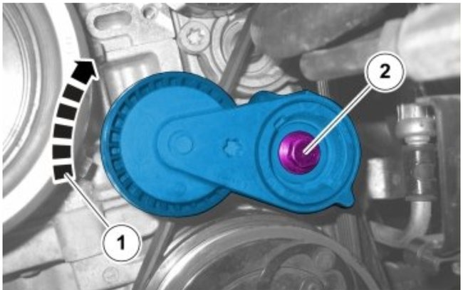 When installing the outer belt tensioner, turn the belt tensioner clockwise (1) and hold it in that position.