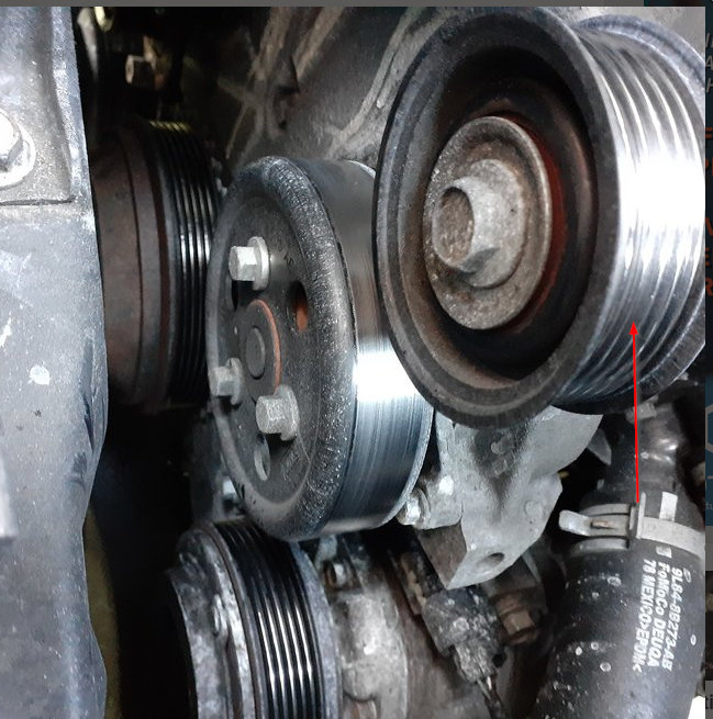 Also, the pulley on the top which appears to be the tensioner is shiny. This means the belt is being dragged over it. If you look at the other pulleys they have a black tint to them and the top one does not. However, the smooth one should look shiny. Only the ones with the rips on it should be like this. It may just be the angle but I suspect this may be part of the issue.