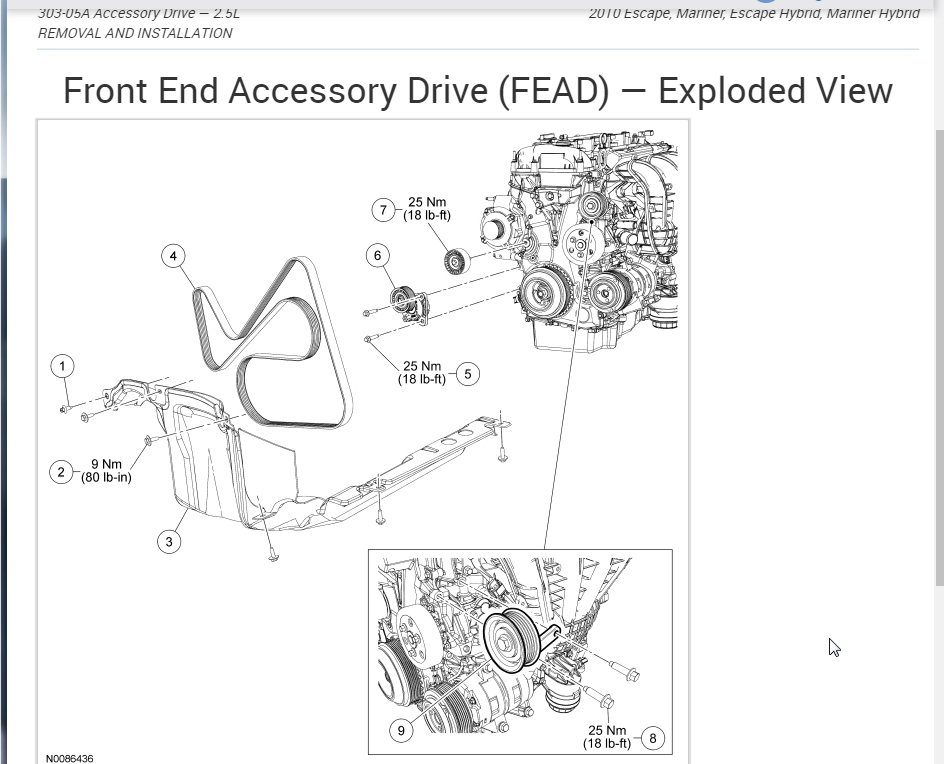 The Serpentine belt busted in our 2010 Ford Escape XLT. My husband would like to fix it himself, but we cannot locate a diagram for a 2010 Ford Escape S belt. Also, the air compressor stopped kicking on and off about 4 weeks before this happened. Could they be related? There's absolutely no change in the engine when you try to kick the air on - like it's not getting power to it? Fix suggestions for a mediocre novice mechanic?