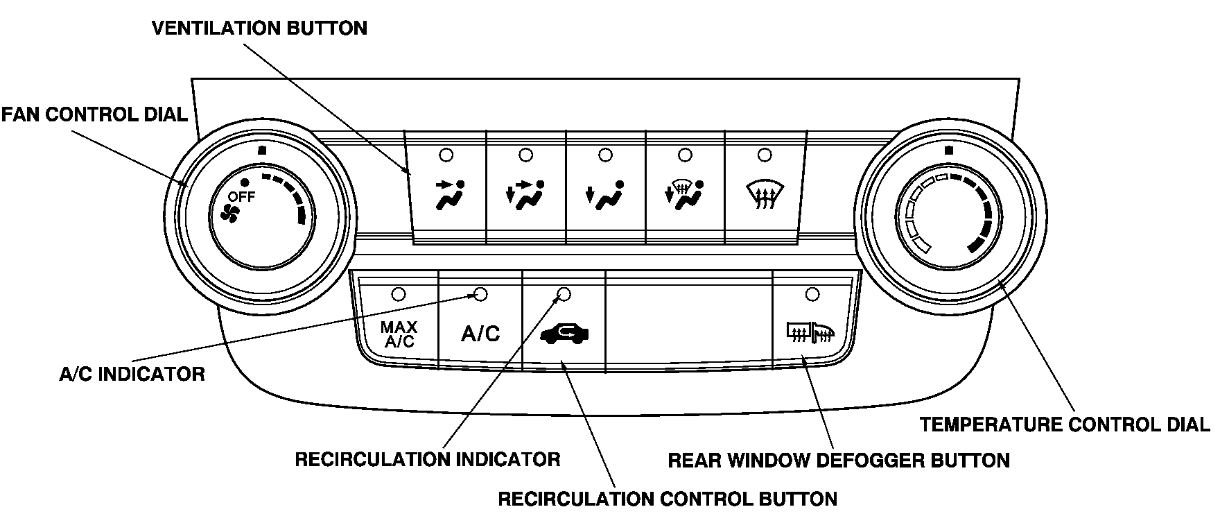 4. Press and hold the RECIRCULATION CONTROL button, then press the REAR WINDOW DEFOGGER button five times within 10 seconds. Release the RECIRCULATION CONTROL and REAR WINDOW DEFOGGER buttons; the recirculation indicator blinks two times, then the self-diagnostic begins.
