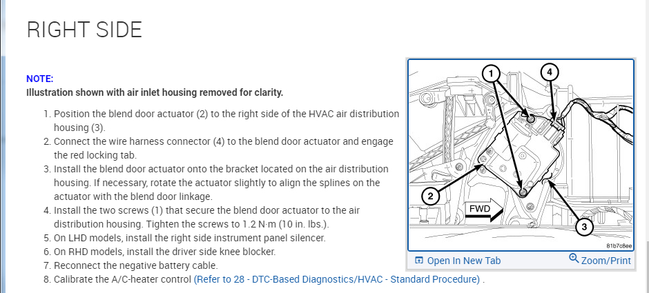 HEATER-A/C CONTROL CALIBRATION The heater-A/C control module must be recalibrated each time an actuator motor or the control module is replaced. If the vehicle is so equipped, the calibration procedure also includes rear HVAC positions for each actuator motor. 1. Turn the ignition switch to the On position. Simultaneously depress and hold the Power and Recirculation buttons on the heater-A/C control for at least five seconds. 2. The manual heater-A/C control power Light Emitting Diode (LED) and Recirculation LED, or the Automatic Temperature Control (ATC) heater-A/C control Delay and Recirculation graphics will begin to flash when the calibration procedure has begun. 3. The calibration procedure should take less than two minutes to complete for the manual heater- A/C control, and less than twenty seconds for the ATC heater-A/C control. When the LEDs or graphics stop flashing, the calibration procedure is complete. 4. If the LEDs or graphics continue to flash beyond the normal three minute (manual) or twenty second (ATC) calibration time, it indicates that the heater-A/C control has detected a failure and a Diagnostic Trouble Code (DTC) has been set. 5. Use a DRBIII® scan tool to perform further diagnosis. Refer to the appropriate diagnostic information. The LEDs or graphics will continue to flash even after the ignition switch is cycled Off and On, until a successful calibration is completed or until the vehicle has been driven about 8 miles.