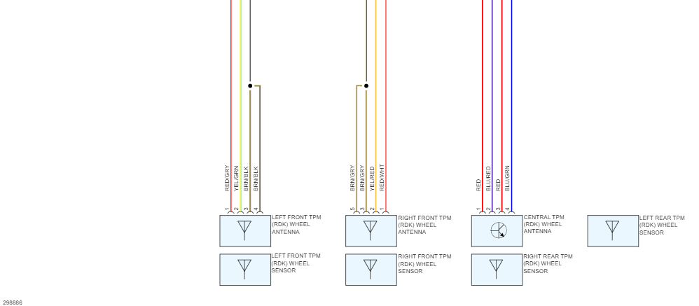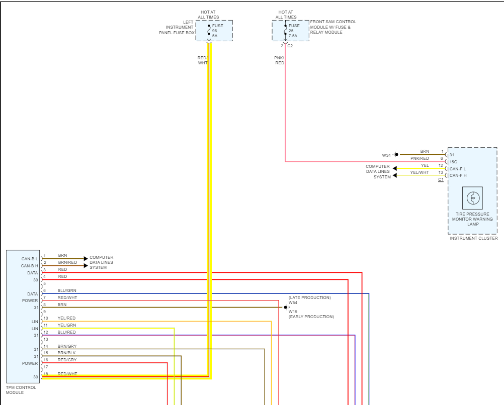 Ok diagrams 6 to 10 are the TPM (Tire Pressure Monitor Module) location and wiring diagrams to check its power supply, It is a 12volt feed from Fuse 96 only 5amp. Check the Ground connection (Brown wire Pin8) also, there should only be 12 volts on the power wire (Red/White wire). This module is also on the CAN bus B network.